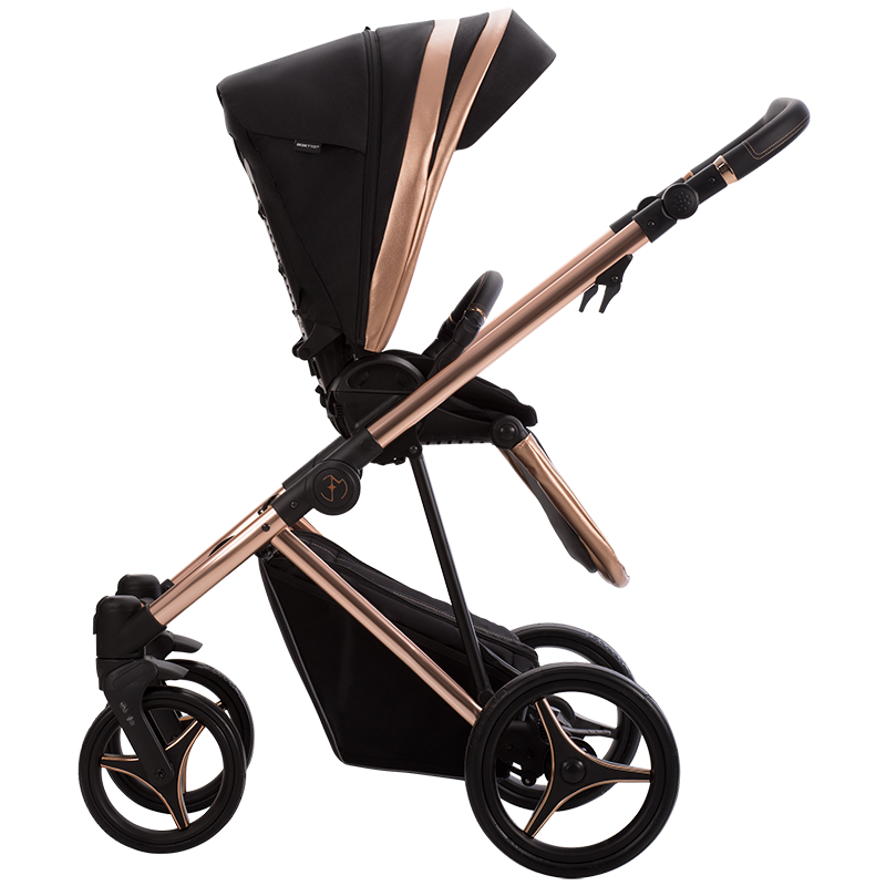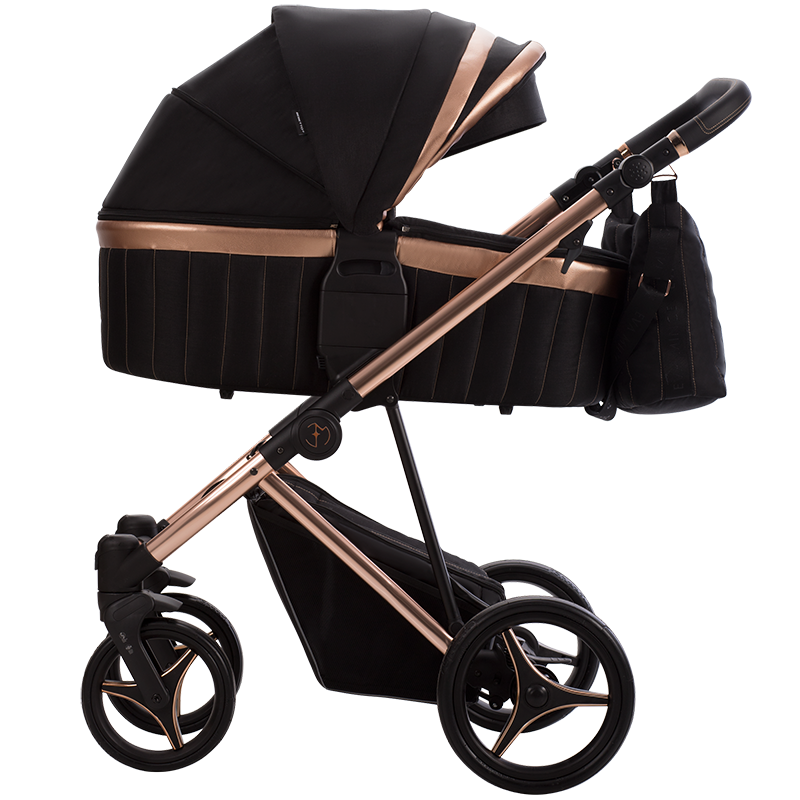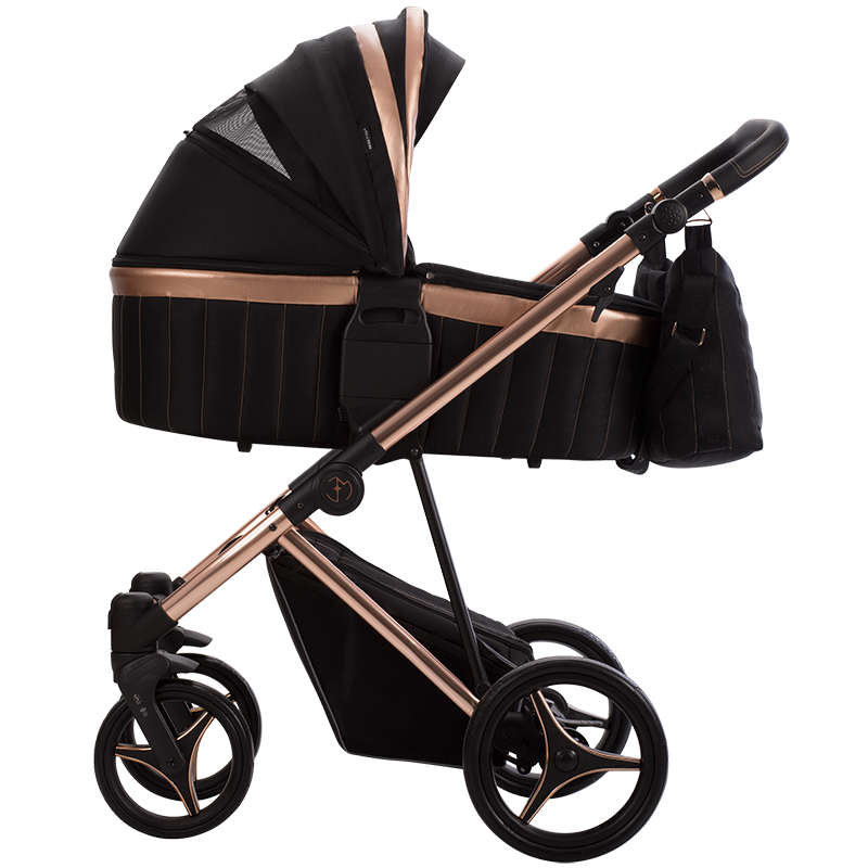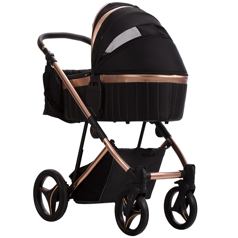 Zewnętrzna warstwa gondoli została starannie obszyta materiałem z eko-skórą, co nadaje jej elegancki, ekskluzywny charakter, a jednocześnie jest odporna na zabrudzenia, co jest istotne w codziennym użytkowaniu. Odkrywany panel z okienkiem pozwala na wygodne obserwowanie dziecka, zapewniając jednocześnie ochronę przed wiatrem. Dodatkowo, w gondoli zastosowano regulowany zagłówek, którego zewnętrzna regulacja pozwala na dostosowanie wysokości podparcia główki dziecka, zapewniając mu wygodną pozycję.