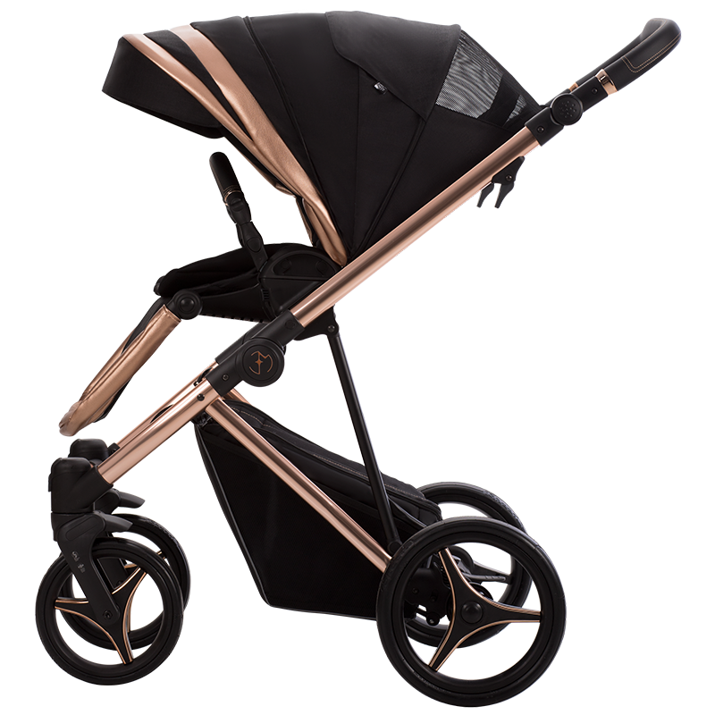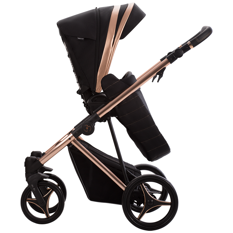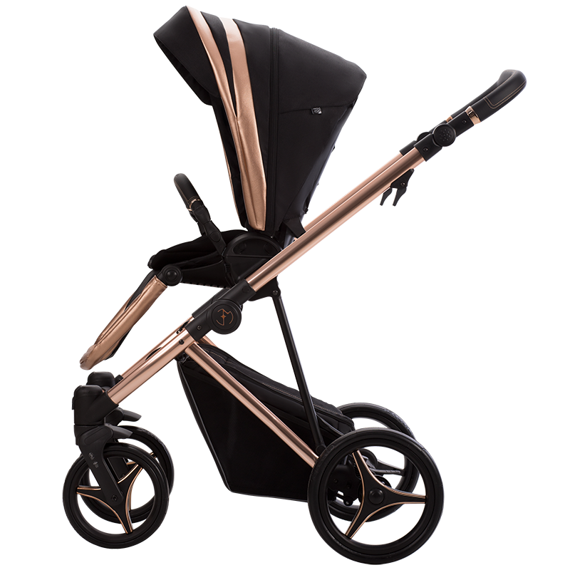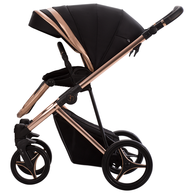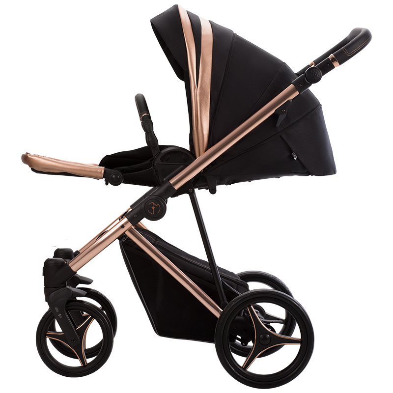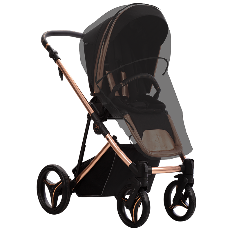 - Wzory logowane na tapicerce oraz eleganckie detale, takie jak tłoczone logo Eva Minge, nadają wózkowi luksusowego charakteru.