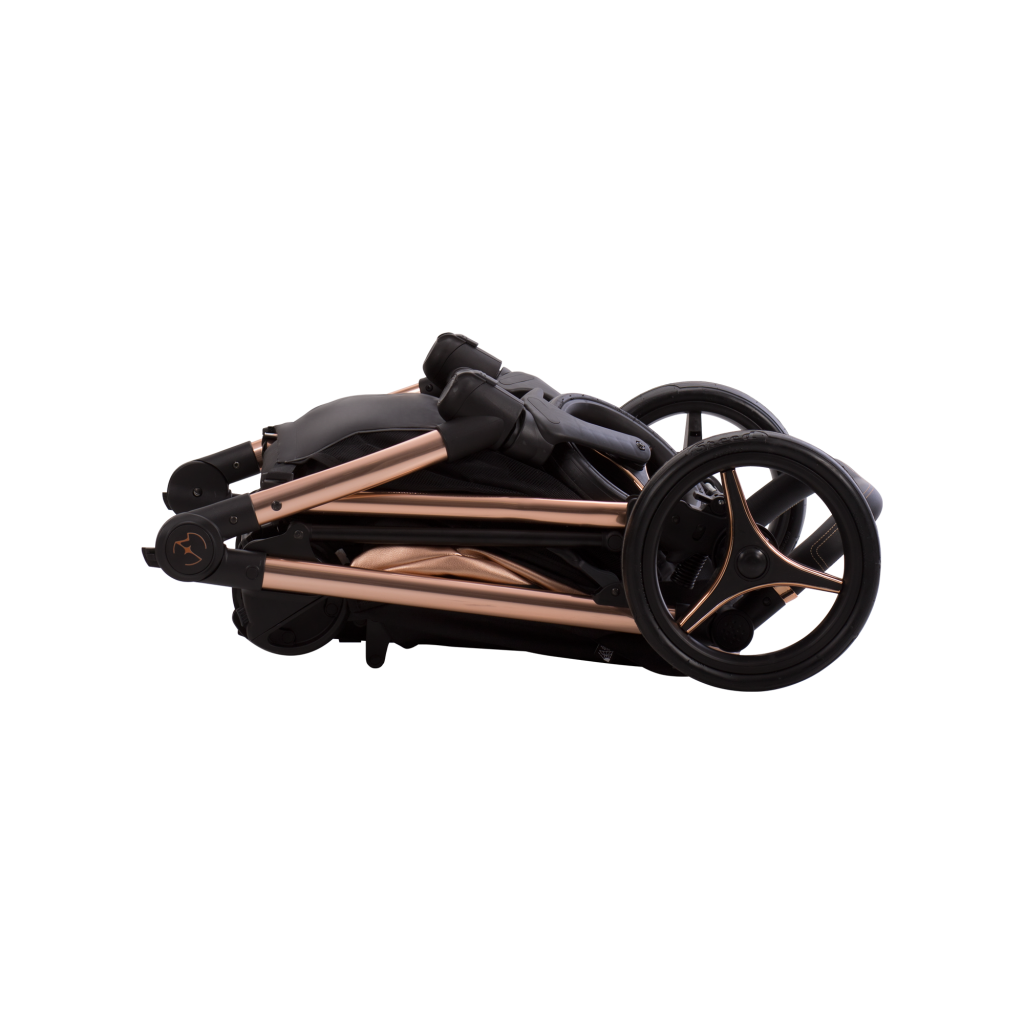- Wózek po złożeniu z wpiętym siedziskiem zachowuje kompaktowe rozmiary – idealne dla rodziców, którzy często podróżują.