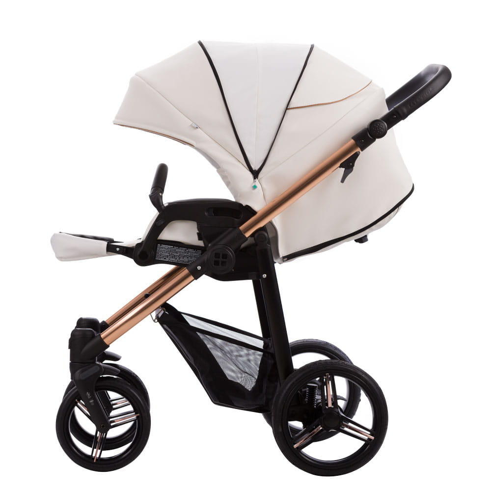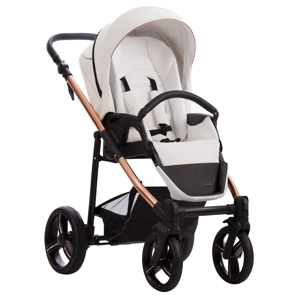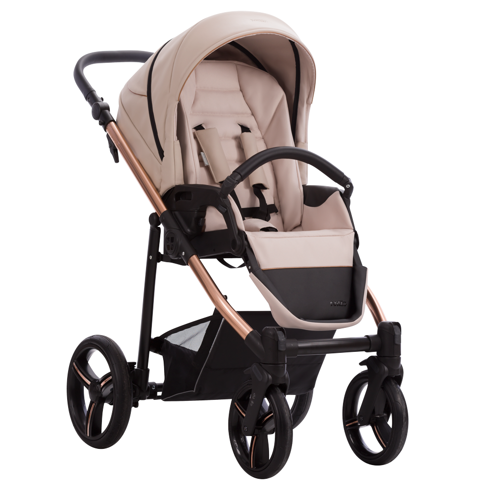 Szukasz spacerówki, która zapewni dziecku komfort w każdych warunkach pogodowych? Właśnie takim modelem jest Bebetto Nico Estilo Pro. Zamiast zwykłego pokrowca znajdziesz w zestawie praktyczny śpiworek, który pozwala w kilka sekund otulić malucha i przygotować go do spaceru. Dzięki temu codzienne wyjścia stają się szybkie i wygodne. Wózek wyróżnia się także eleganckim wyglądem – połączenie białej lub czarnej eko-skóry z połyskującą konstrukcją w kolorze miedzi sprawia, że prezentuje się niezwykle stylowo. Całość dopełniają starannie wykonane detale, które podkreślają luksusowy charakter modelu.