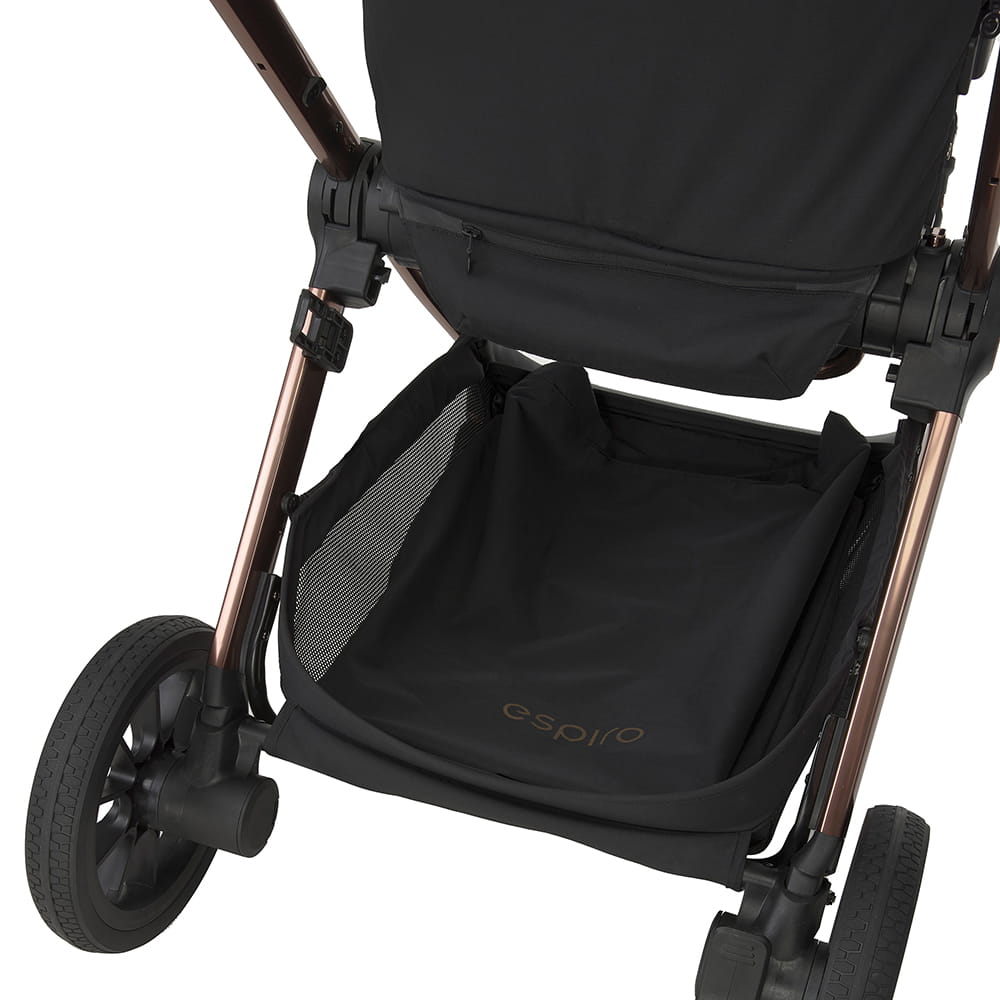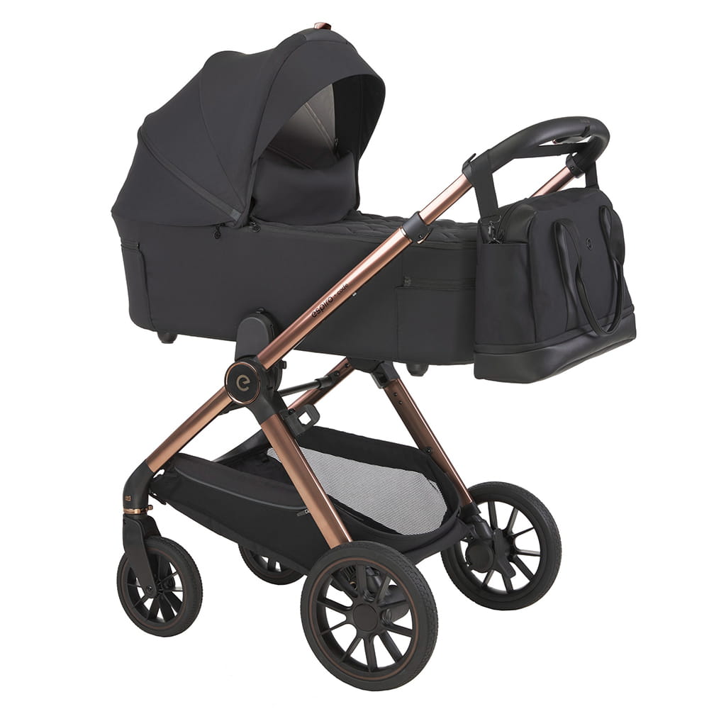 Wózek Espiro Code został wyposażony w obszerną torbę z funkcją powiększenia, która pomieści wszystko, co niezbędne w codziennym życiu rodzica: