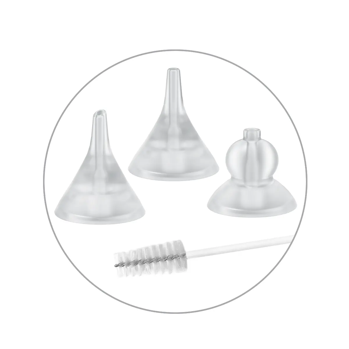 Aspirator został zaprojektowany tak, aby łączyć skuteczność z przyjaznym dla dziecka działaniem. Uspokajające melodie oraz delikatne, kolorowe światełko pomagają stworzyć spokojną atmosferę, ułatwiając odsysanie wydzieliny bez stresu i dyskomfortu. Trzy ultramiękkie silikonowe końcówki dopasowują się do wieku dziecka i rodzaju wydzieliny, zapewniając skuteczne, a zarazem bezpieczne czyszczenie nosa.